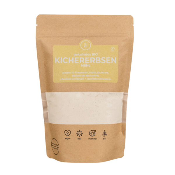 Durch den Keimvorgang wird die Kichererbse basisch und besser verdaulich. Das Mehl zeichnet sich durch einen hohen Proteingehalt aus und liefert dir gesunde Inhaltsstoffe wie Vitamine, Mineralstoffe, essentiellen Fettsäuren und sekundäre Pflanzenstoffe, welche durch den Keimvorgang besser aufgeschlossen werden können. Außerdem versorgt die Kichererbse deinen Körper mit wichtigen Aminosäuren sowie Ballaststoffen. Es kommt zu einer besseren Bioverfügbarkeit der Nährstoffe.