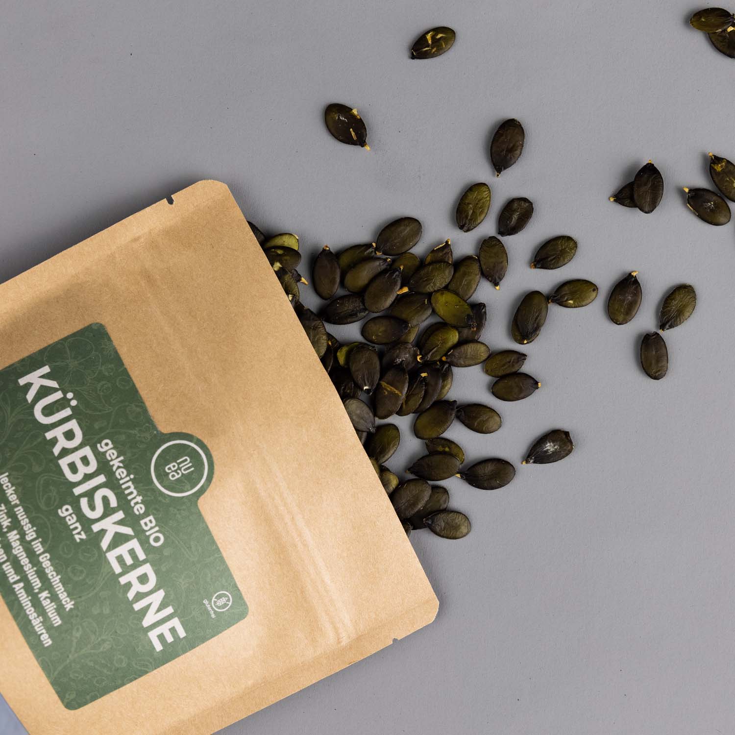 Gekeimte Kürbiskerne sind für unseren Körper besser bioverfügbar, da die nährstoffbindende Phytinsäure im Keimprozess abgebaut wird. Du kannst die enthaltenen Vitamine, Mineralstoffe und Spurenelemente viel besser aufnehmen. Deine Verdauung wird entlastet, da die schwerverdauliche Stärke durch das Keimen vorgespaltet wird. Tryptophan, die Aminosäure mit ihrer stimmungsaufhellenden Wirkung, sowie das Spermidin, welches die Autophagie aktiviert in den menschlichen Zellen – also das Zellrecycling – finden wir im Kürbiskernkeimling.
